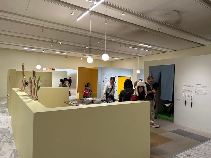 And, of special interest to us here, there are little activity areas for children scattered among the connecting bridges between galleries. These areas feel different from the galleries, more casual, more accepting of noise. It would be completely possible to make a quick pass through an exhibition space while children are occupied with one of these activities, or to break up the exhibition visit with stops at these stations.