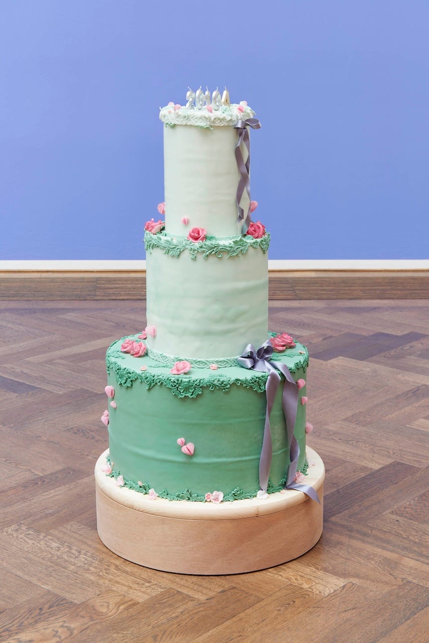 A three-tier anniversary cake to mark four years of being a mother, ten years of being an artist, and twenty years with her partner.