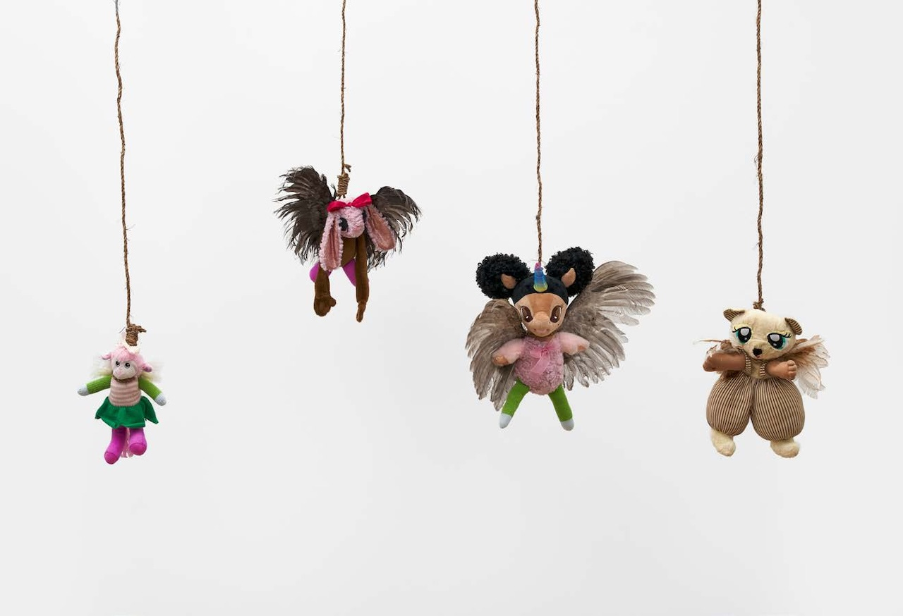 Precious has been working with things that look like kids’ toys for a while. She sees the bears as a reservoir of the “innocence, violence, submission, play” that is the stuff of childhood. They often appear in horticultural configurations, like Beloved, the animatronic bear in the same couture lingerie breathing and blinking, passed out at the heart of a garden of poisonous plants. Smaller toys started appearing more recently. Mendes Wood had a group of them at Basel last week, captioned as “artist-made children’s toys with taxidermied bird wings, rope, motors.” They are equally adorable and horrifying.