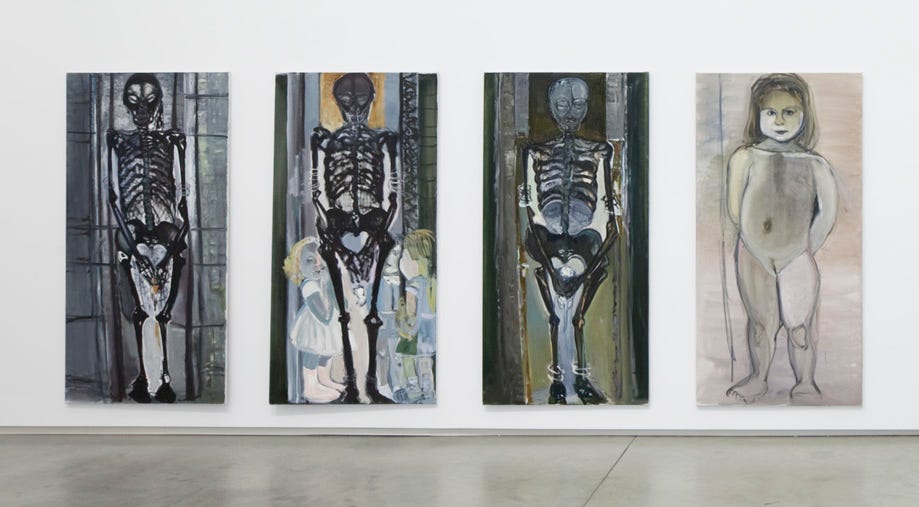 Sexuality, pregnancy, childhood, and death are some of the parallel lines that track through Marlene’s work over the past half century. It might be this disconcerting suite of four paintings that captures the darkly existential joy of what she brings to painting better than any other. Here stands Helena again, maybe three years old, mischievous and defiant and innocent and knowing, flanked by three skeletons with their own dolls and children. The painter’s child is the only memento mori she needs.