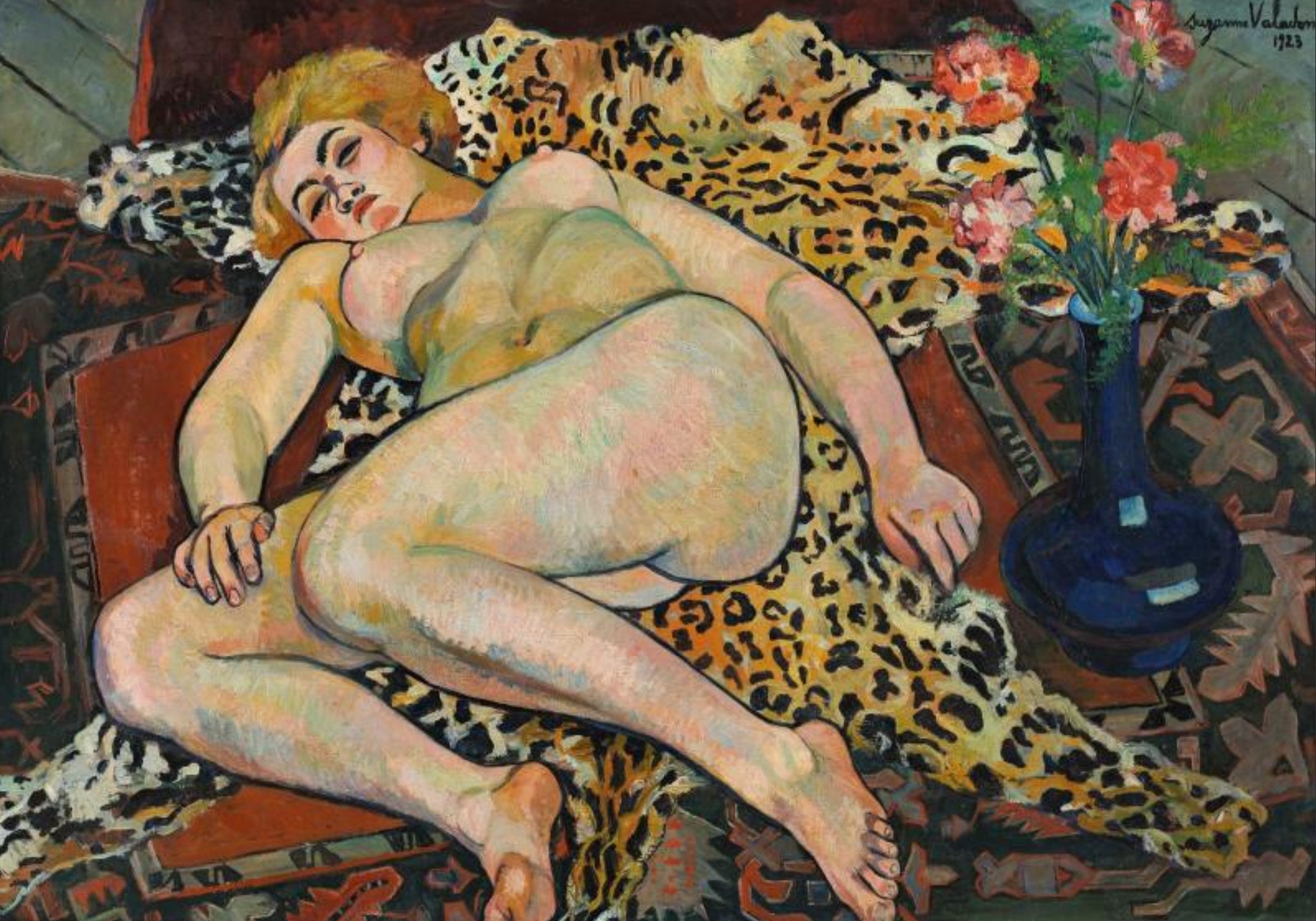 Suzanne made what I consider her best paintings in her fifties and sixties, in the two decades prior to her death in 1938. The Pompidou exhibition opens with La Chambre bleue (1923), one of several pictures that are so stupidly brilliant that they could pull the wall straight down into the floor. A heavyset woman in a pink camisole and striped green pajama pants rests on one elbow, books at hand, an unlit cigarette between her lips. The bedspread is Matisse and the wall behind is Joan Mitchell. From the same year, Catherine nue allongée sur une peau de panthère (1923) has a reclining nude on a leopard skin over a rug, pink poppies in a blue glass vase perched perilously close to languorously draped fingers. The rainbow skin of this buttock slam in the center of the frame—it contains the universe.
