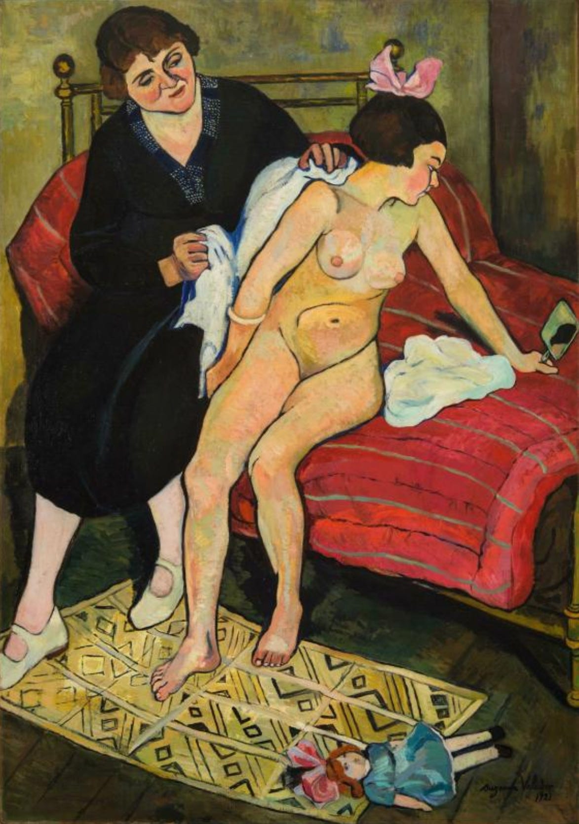 It should be clear from this description alone how Suzanne’s work fits into the story I have been telling about how the life of the family fits into and alongside the life of the artist. With Adam et Eve (1909) she became, some say, the first woman to paint a full-frontal male nude; her new husband guides her hand towards the forbidden fruit. Portraits de famille (1912) pictures her surrounded by her mother (whose face is deeply scarred with wrinkles here and nearly everywhere she appears), her son (dreamy and erect), and her second husband (resigned; at peace). One of my favorite pairings in the exhibition captures the arc of childhood: Marie Coca et sa fille Gilberte (1913) finds Suzanne’s grandniece with a doll on her lap, leaning against her mother’s legs. Later, in La Poupée Délaissée (1921), the girl is grown, turning away from her mother and absorbed in her own reflection in a handheld mirror. The titular doll—the same one from eight years earlier—rests on the floor. Suzanne had a special love for mirrors, both handheld and wall-mounted, and for boudoir scenes, and in particular for the twisting and stepping poses of getting into and out of the bath. (See La Petite Fille au miroir, 1909.) She is, I believe, the patron saint of the rear three-quarter-angle nude.