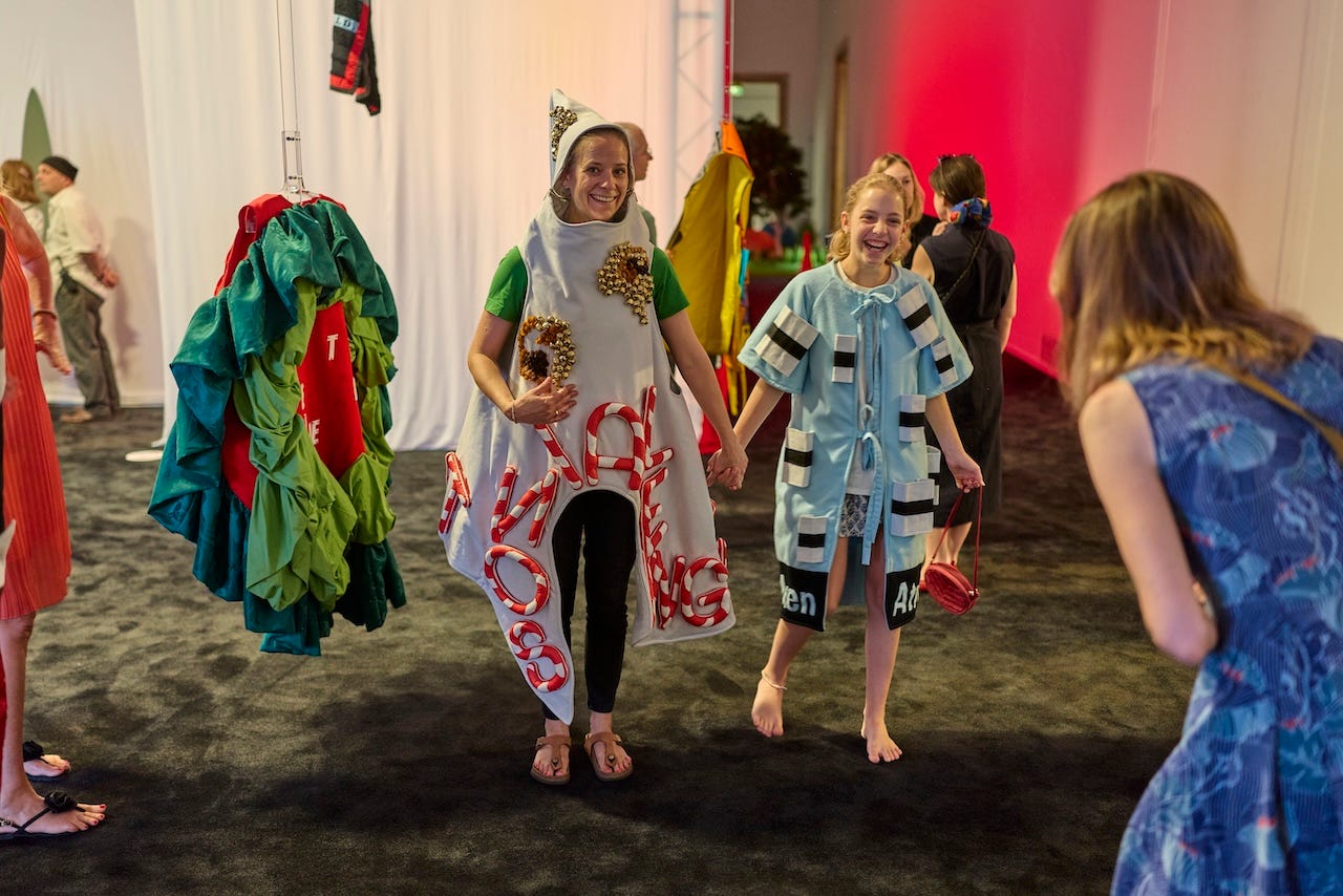 The second thing about this show for me is it doesn’t shy away from the more discursive side of contemporary art—for every LEGO play tray and costume dress-up station there is a video installation or audio work. It’s able to accomplish this by stating clearly up front that “The exhibition is not a playground.” I like the effort to normalize exhibition-going as a practice for children, young people, and families: here is a hammock, check the sign, looks like it’s okay to lie down here, here is a guitar on the carpet, check the sign, not supposed to touch this one. As a result we find complex and layered relationships between reality and performance, from environments that welcome interaction to videos and documentation of moments from which we are excluded.