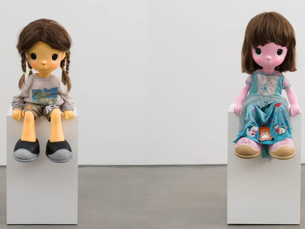 It’s really fun watching how artists of a certain generation see their practices twist and morph as they become parents (or choose not to become parents themselves but see children enter their lives otherwise). Sayre’s work is best known for a neo-photorealist pathos of the southern Californian urban landscape, the stuff of strip malls and telephone poles and road signs and graffiti, so I was struck by this incoherently adorable pair of sculptures. He explains to Artnews:
