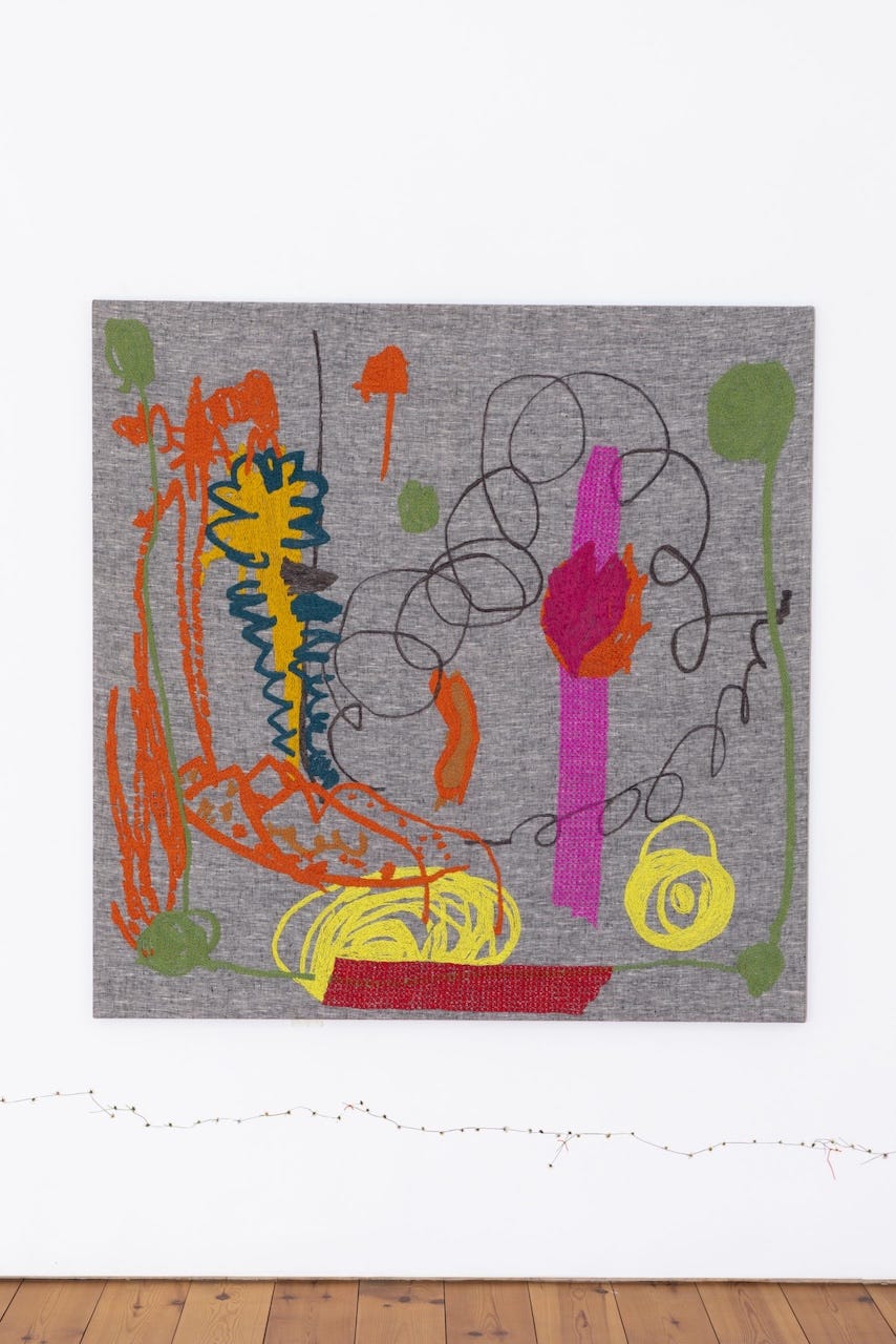 Amalia is an artist who draws on her experiences with children—her own and others—in a straightforward way without making this a thematic element of the way her practice is framed. As she frames it in this exhibition: “I am someone who works from the world. I don’t make worlds myself. I’m constantly looking around and finding or drawing on things.” Her “Keepsake” series of embroideries are based on the intuitive abstractions her son drew before he was able to think in terms of “pictures.” It reminds me of how Oscar Murillo uses kids’ scratches on school desks to tap into the global unconscious. Amalia has also included a pressed daisy chain of epic scale that really ties the room together. There is a great interview on Studio International.