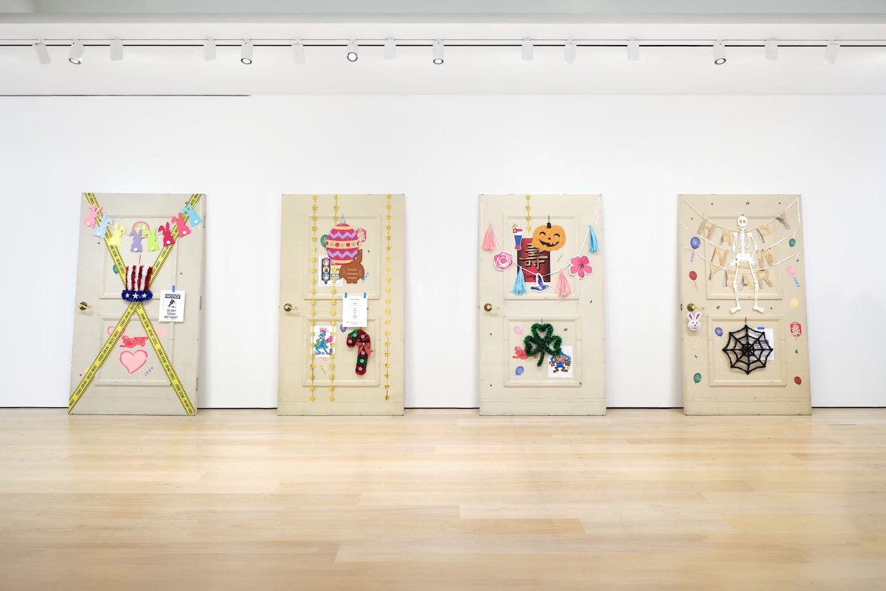 Amanda’s instantly iconic Untitled Thresholds (FOUR SEASONS) (2025) is featured in the Hammer’s biennial exhibition “Made in LA,” which is on until March. She has recreated at larger than life size the door to her father’s nursing home room, then decorated them with the banal seasonal decorations endemic to institutional settings. Although there are four doors, suggesting a cycle of four seasons, the decorations are all out of order: a skeleton hangs over a sparkling Happy New Year banner, an Easter bunny sat to one side. I find this work dripping in the pathos of the passage of time on multiple scales.